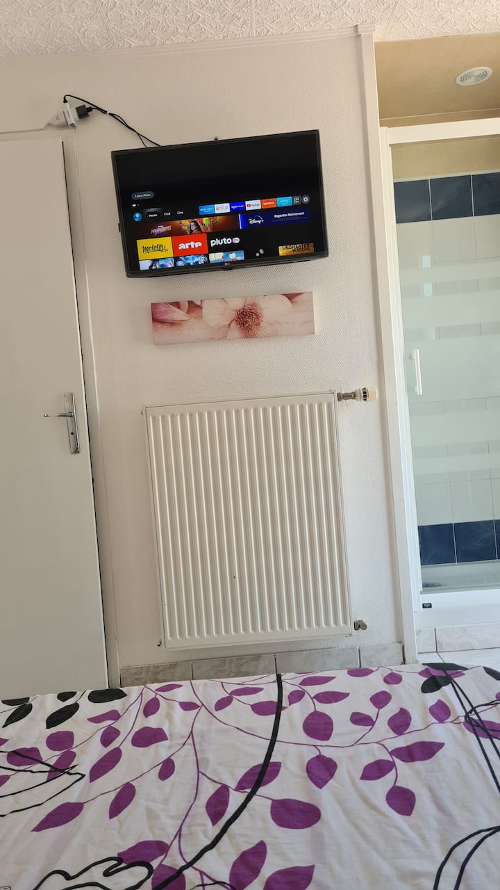Chambre confortable, av. sanitaires, parking, tv..