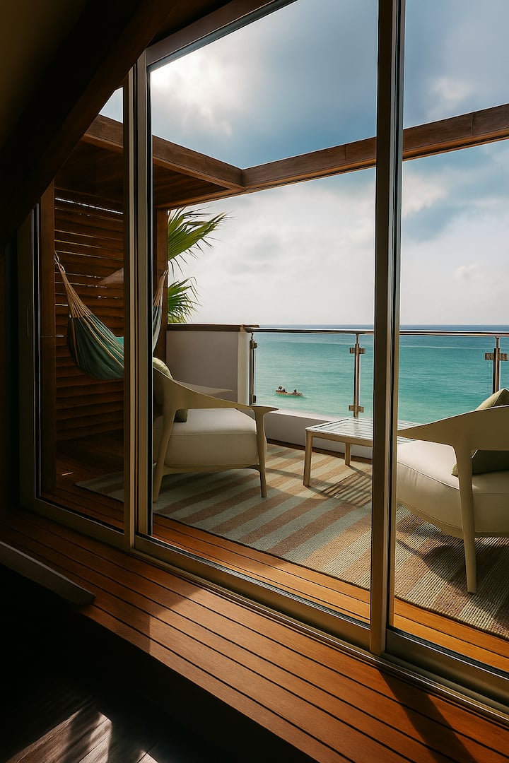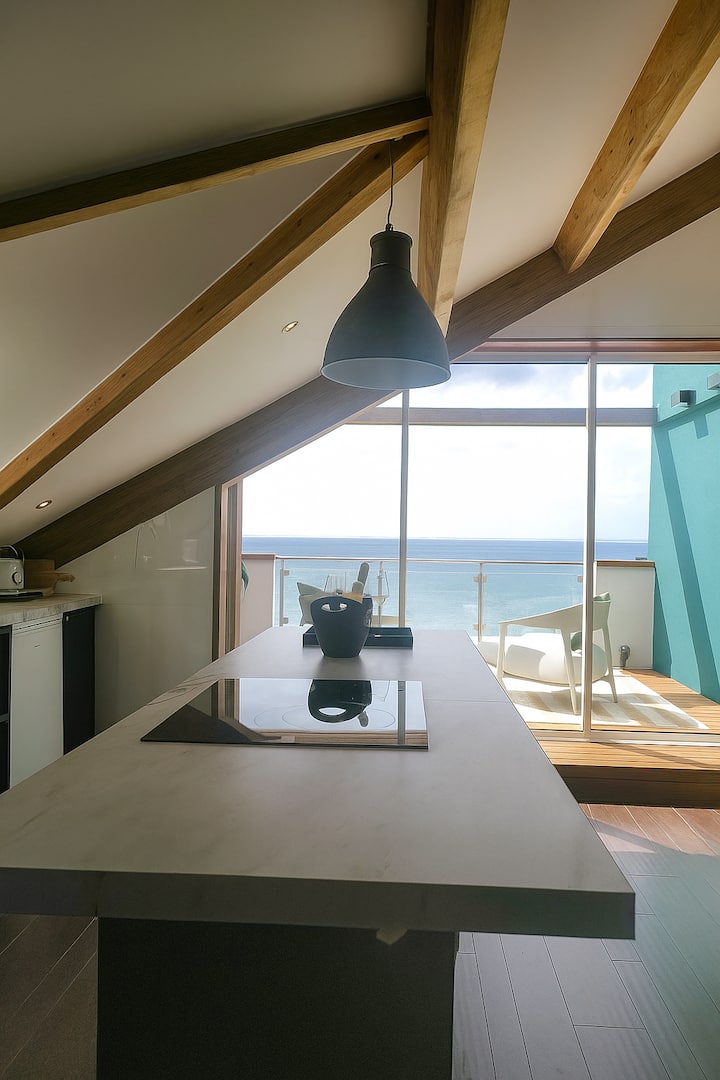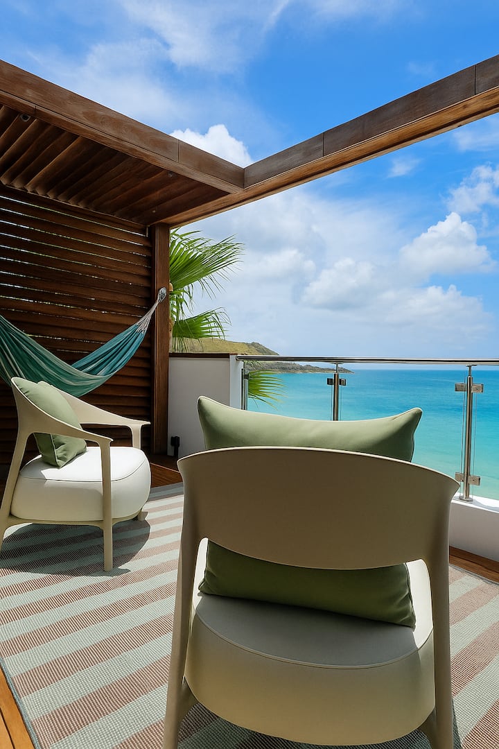 ლოფტის ყველა ნაწილიდან იშლება კარიბის ზღვის პანორამული ხედი — ცისა და ოკეანის ცოცხალი ბარათი.