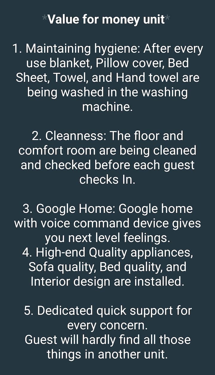 🔴Ჩვენ ვიცავთ დასუფთავების წესებს. Თუ მისი არ არის სუპერ მასივი, მაშინ არ უნდა გადაიხადოს. Სტუმარს შეუძლია ისარგებლოს დასუფთავების არასავალდებულო გადასახადებით, თუ არ სურს საცხოვრებლის დასუფთავება, შეუძლია ისარგებლოს 200 PHP-ით მომსახურებით.