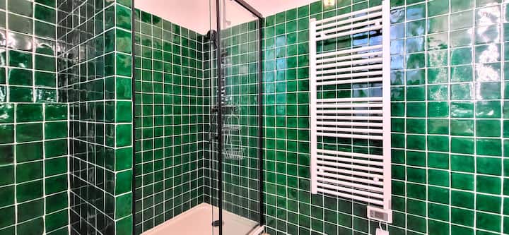 Სააბაზანო თანამედროვე და მაგარია: დახვეწილი სააბაზანო, რომელიც გაფორმებულია მწვანე ფერებში, ფართო საშხაპითა და ჩაშენებული უნიტაზით.