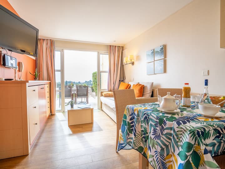 Დიდი კურორტი „Village Cap Estérel - Le Village“. Გარეუბანში, აგაის ცენტრიდან 2 კმ-ში, ფერდობზე, საცხოვრებელ უბანში, ზღვიდან 900 მეტრში, პლაჟიდან 900 მეტრში, გზა გადაკვეთისკენ, გოლფის მოედანზე, საფეხმავლო ტერიტორიაზე. Საზიარო გამოყენებისთვის: პარკი 210 ჰა, 5 საცურაო აუზი (სეზონური ხელმისაწვდომობა: 06.Apr. - 03.Nov.). Საბავშვო აუზი, ბოკია, საბავშვო სათამაშო მოედანი (სასრიალო, საქანელა). Კომპლექსში: სპა ‑ სივრცე (დამატებითი), სავაჭრო ობიექტები, სამრეცხაო (დამატებითი). Მაღაზია 500 მ, სასურსათო, სუპერმარკეტი 6 კმ, რესტორანი 500 მ, საცხობი, ავტობუსის გაჩერება "Ligne 21" 300 მ, რკინიგზის სადგური "Saint-Raphaël-Valescure TGV" 9 კმ, ქვიშიანი პლაჟი "Tiki Plage" 900 მ. Მარინა 1 კმ, გოლფის მოედანი (9 ხვრელი), ჩოგბურთი 500 მ. Ახლომდებარე ღირსშესანიშნაობები: ანთეორი 8 კმ, სენ-რაფაელი 9 კმ, ფრეჟუსი 13 კმ, კანი 33 კმ, სენ-ტროპე 50 კმ, ნიცა 76 კმ. Კარგად ცნობილი ტბები ადვილად მისადგომია: ლაკ-სენ-კასიენი. Სალაშქრო ბილიკები: Massif de l 'Estérel. Გაითვალისწინეთ: ავტომობილის გარეშე დასასვენებელი კომპლექსი, ლიფტის გარეშე. Გართობა სეზონზე. Შესაფერისია ოჯახებისთვის, სეზონზე ბავშვებზე ზრუნვა (დამატებითი). Დაცული საცხოვრებელი. შესაძლებელია დამატებითი საცხოვრებლების დაჯავშნა. Ბინებზე წვდომა შესაძლებელია საფეხურების მეშვეობით, პირველ სართულზეც კი.