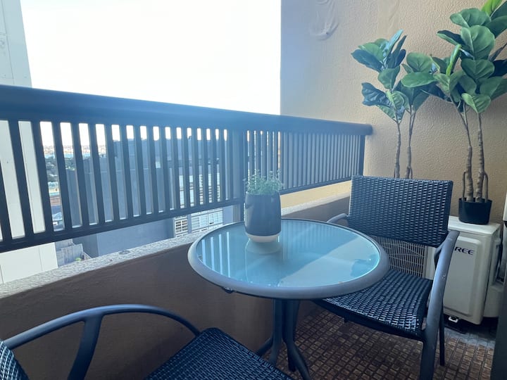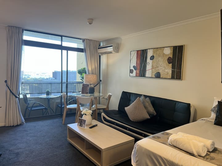Მაღალი სართულის ქალაქის სტუდიო აივნით
