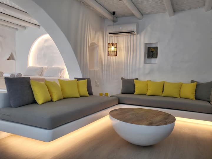 - დასასვენებლად დასაქირავებელი საცხოვრებლები გარე დასაჯდომი ადგილებით: მიკონოსი
