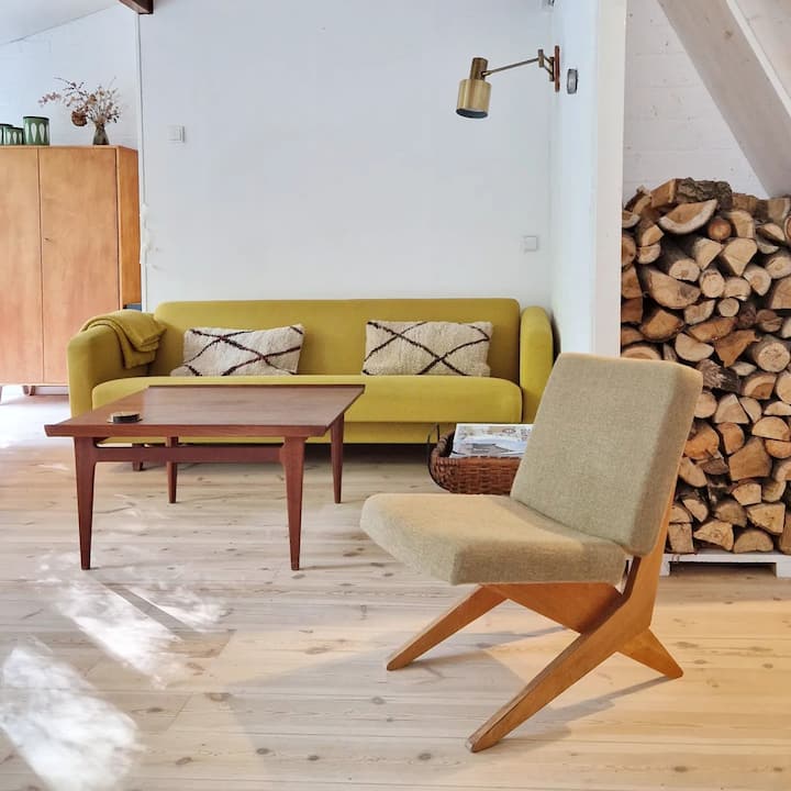 Თანამედროვე დიზაინის ბუნგალო ბუხრით.