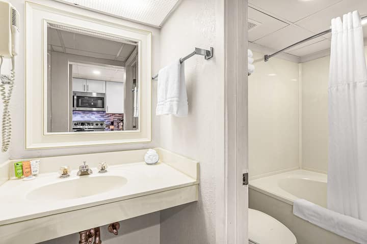Ჩვენი ერთსაძინებლიანი, ერთსაძინებლიანი კონდომინიუმი იდეალური დასვენებაა მაქსიმუმ ოთხი სტუმრისთვის და უზრუნველყოფს მშვიდ დასვენებას სახლის ყველა კომფორტით. Საძინებელი, მყუდრო საკურთხეველი, გთავაზობთ ორ რბილ საწოლსა და 50-დუიმიან 4K სმარტ-ტელევიზორს, რომელიც უზრუნველყოფს მშვიდ ღამეებს. Აღსანიშნავია განახლებული სააბაზანო ჯაკუზით, რომელიც გთავაზობთ ლუქს-კლასის ადგილს პლაჟზე ერთი დღის შემდეგ განტვირთვისთვის ან ადგილობრივი ტერიტორიის დათვალიერებისთვის.