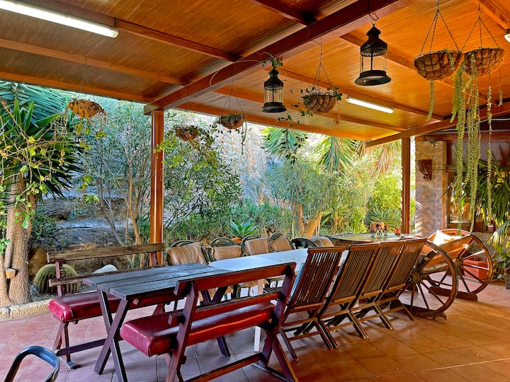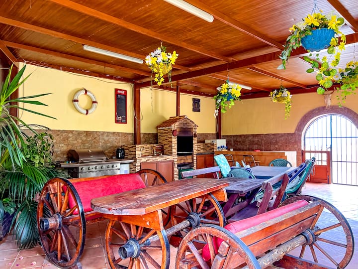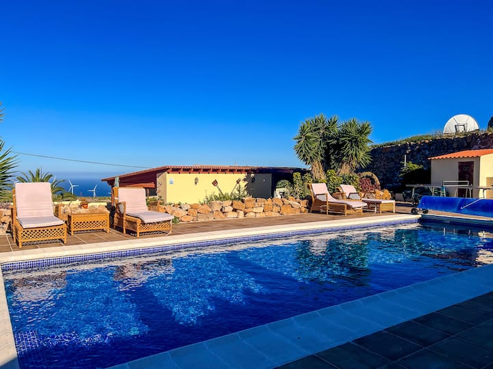 Დახვეწილი სახლი სოფელში, რომელსაც აქვს ბაღი, აუზი და ხედები.