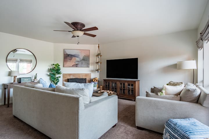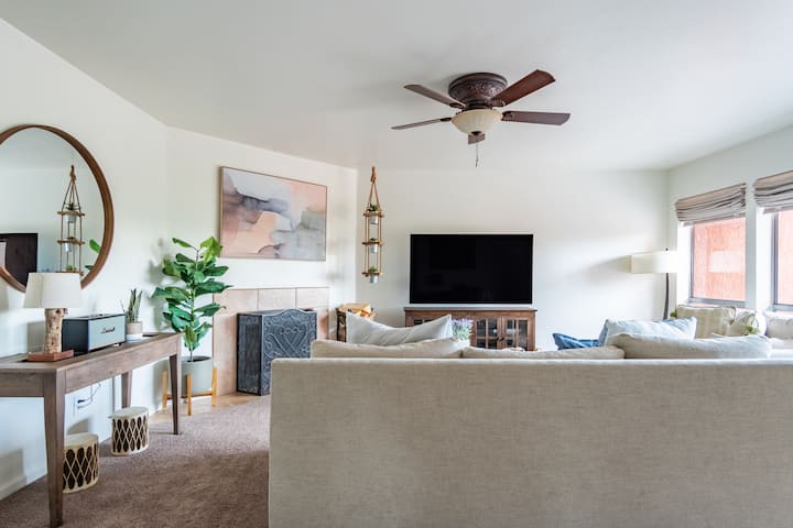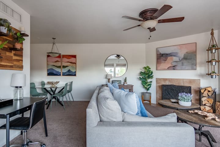 Ჩემი 2-საძინებლიანი, 1-საძინებლიანი კონდომინიუმი ამჟამად გთავაზობთ 5-ვე ვარსკვლავიან შეფასებას და გამოირჩევა თანამედროვე ბოჰემური სტილით, სადაც ყველა ოთახს დამამშვიდებელი შეხებაა. Მისაღები ოთახი მყუდროა და იდეალურია ფილმების საყურებლად და მუსიკის მოსასმენად მაღალი დონის Bluetooth სპიკერზე. Თქვენს გასართობად დიდი ტელევიზორია YouTube TV-ზე უფასო წვდომით.