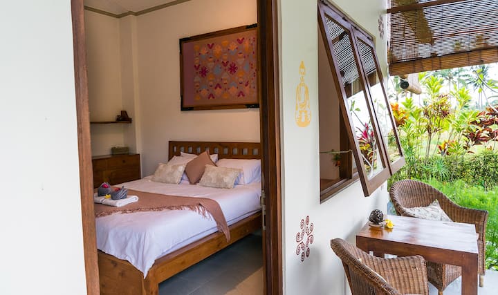Უბუდის ვიბრაციის სიყვარულით, შევიძინე სახლი სიმშვიდის ოაზისში და მინდა ჩემი სივრცე გავუზიარო ადამიანებს, რომლებიც აფასებენ ბრინჯის სილამაზესა და სიწყნარეს ცენტრთან ახლოს, ორი წუთის განმავლობაში სკუტერით, გზა, რომელიც ჩემს სამოთხეში მოაქვთ, სავსეა ლამაზი ადგილებით საჭმელად და დასალევად ადგილობრივი და ჯანსაღი საკვები.