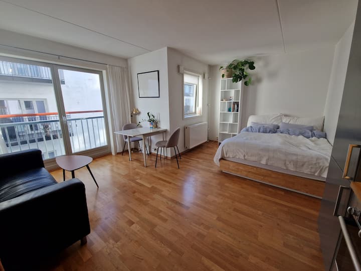 მყუდრო სუპერცენტრალური პატარა ბინა მე-5 სართულზე ოსლოს ცენტრში, ფრანგული აივნით პირდაპირ ოსლოს ავტობუსის ტერმინალთან/ ოსლოს რკინიგზის მოედანთან,