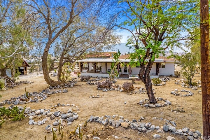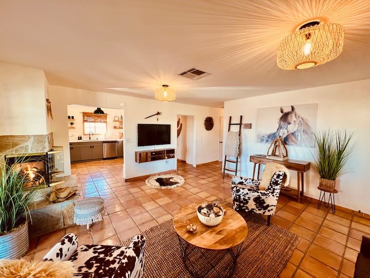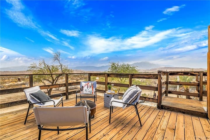 Უნიკალური, ახლადგახსნილი თანამედროვე უდაბნოს რანჩო, სკაი-ველიში, განმარტოებულ კერძო ტერიტორიაზე. Მდებარეობს ზოლის ბოლოს, დიდ ტერიტორიაზე. Თანამედროვე შიდა სივრცეები მოიცავს 3 საძინებელს, 2 სააბაზანოს, მისაღებ ოთახს, სამზარეულოს, ქედებისა და უდაბნოს თვალწარმტაცი ხედები ყველა ფანჯრიდან, რომელიც ერთმანეთთან აკავშირებს ღია ცის ქვეშ და შენობის შიგნით. Ახალი სამზარეულო თეთრი კვარცის კონტეინერით, კარადის უჯრებით, ახალი საყოფაცხოვრებო ტექნიკითა და გაზქურის ზედაპირით. Მისაღებ ოთახში არის ბუხარი.