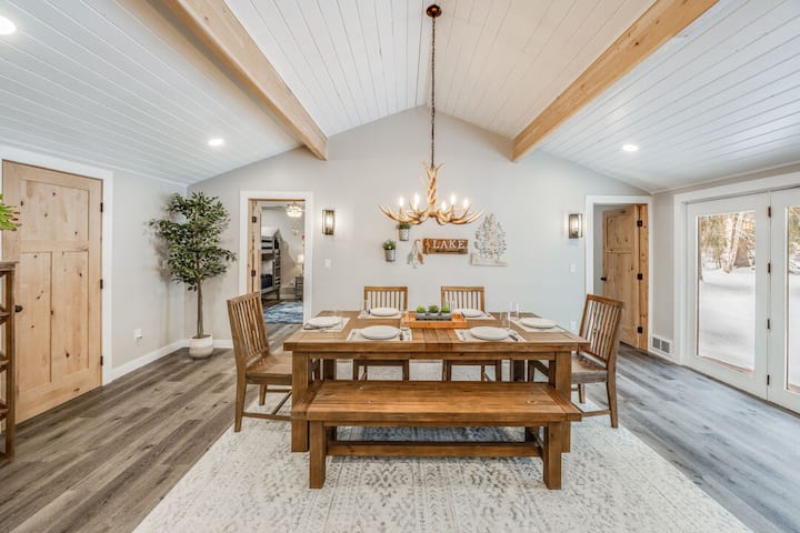 Ეს ერთდონიანი გადაკეთებული სახლი გთავაზობთ 1,650 კვადრატულ ფუტს, სამ საძინებელსა და ორ სააბაზანოს რვა სტუმრის მისაღებად. Თქვენ შეხვალთ საცხოვრებელში შესასვლელი კარიდან და შეაბიჯებთ ღია და ნათელ შესანიშნავ ოთახში, რომელშიც განთავსებულია მისაღები ოთახი, სასადილო სივრცე და სამზარეულო. Მისაღები ოთახი გთავაზობთ კომფორტულ თანამედროვე ავეჯს, მყუდრო გაზის ბუხარს, სმარტ-ტელევიზორს საკაბელოთი და დიდ ბუნებრივ განათებას სურათის დიდი ფანჯრიდან. Თქვენ ასევე იპოვით სახალისო ფოსბოლის მაგიდას. Სამზარეულო სრულად აღჭურვილია უჟანგავი მოწყობილობებით, მათ შორის, გაზის დიაპაზონით და სამზარეულოს ცენტრალური კუნძულით 4 ადგილიანი დასაჯდომით. Ამ საცხოვრებელში ასევე არის დამონტაჟებული სარეცხი მანქანა და საშრობი. Სასადილო ოთახში არის მაგიდის სკამი და სკამი შვიდი ადამიანისთვის.