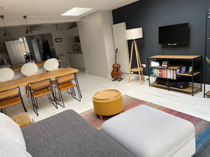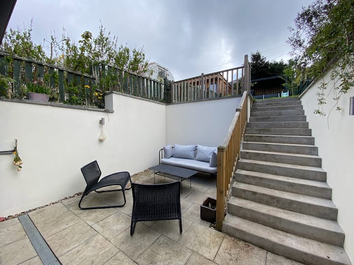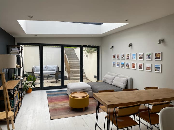 Ნათელი საცხოვრებელი სამუშაო სივრცეებითა და მზისგან დამცავი ბაღით