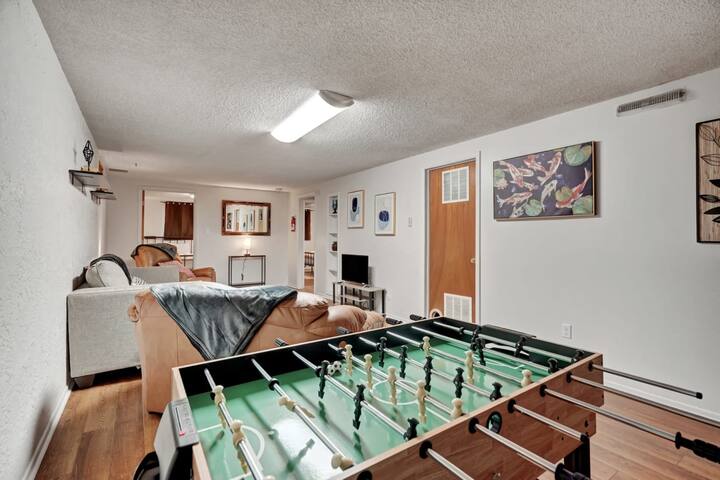 Მზის ოთახიდან კიბის ქვემოთ არის სარდაფის დონის საოჯახო/სათამაშო ოთახი და კიდევ ორი საძინებელი. Დამატებითი საცხოვრებელი სივრცე აღჭურვილია ორი ტახტით, სავარძლით, გრანდიოზული ფორტეპიანოთი, ფოსბოლის მაგიდით და ტელევიზორით. Ბევრი დასაჯდომი ადგილით და მოსახერხებელი ყავის მაგიდით წასახემსებლებისა და სასმელების დასაგემოვნებლად, ეს იდეალური ადგილია ჯგუფებისთვის. Ტახტების ზემოთ მცურავი თაროები არა მხოლოდ ელეგანტურია, არამედ წიგნების კოლექციაა ასარჩევად. Დაუკარით სიმღერა ფორტეპიანოზე ან ფოსბოლის თამაში და არასოდეს მოიწყინოთ ამ ოთახში!