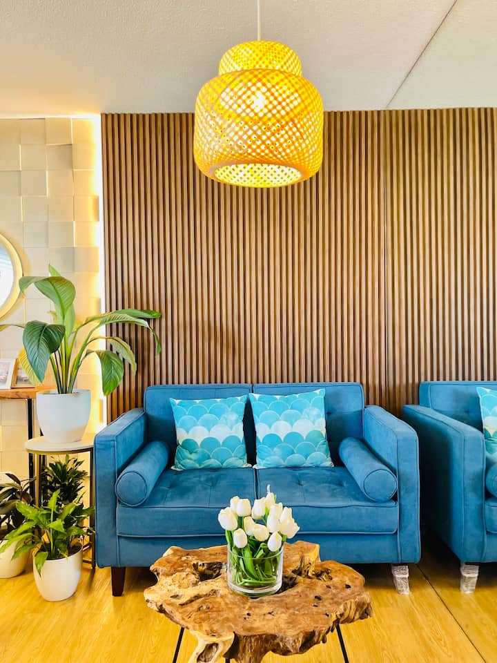 - კაკლის ხის slat ელემენტები, სადაც მდგომარეობს ორ ადგილიანი საფირონის ლურჯი დივანი აქცენტი ჩააგდოს ბალიშები სრულყოფილი ემთხვევა, როდესაც თვალს თქვენი საყვარელი NETFLIX სერია უნიკალური driftwood ყავის მაგიდა, სრული საცხოვრებელი ფართი პაკეტი.
