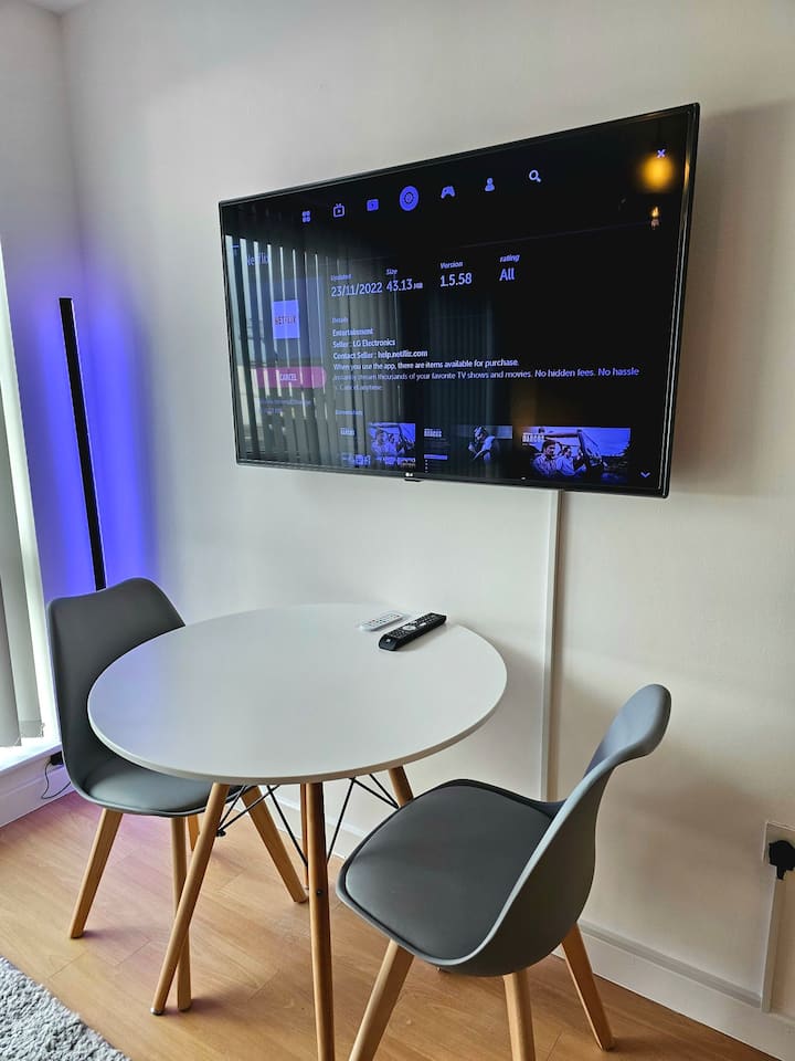 მაღალი გარჩევადობის 49‑დუიმიანი ტელეეკრანი და Amazon Prime Video, Apple TV, Disney+, Netflix