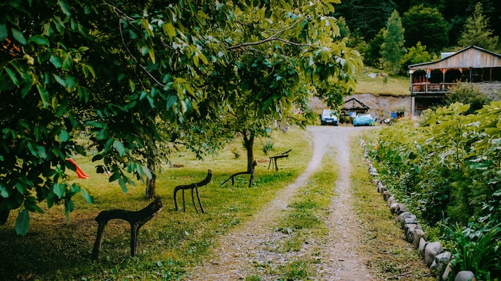 Სახლი ჩემმა მეუღლემ და ვაჟებმა ააშენეს, რომლებიც მხატვრები და პოეტები არიან, ყველა ავეჯი ხელით არის გაკეთებული, რაც ჩვენს საკუთრებას ხასიათს მატებს. Სახლი გარშემორტყმულია მთებით, შორიდან კი ბუნებრივი ნაკადულები ისმის. Თუ გიყვართ ველური ბუნება და არ მოგწონთ ტრივიალური დატვირთული ტურისტული ადგილები, მაშინ ჩვენი საცხოვრებელი იდეალურია თქვენი გაქცევისთვის.