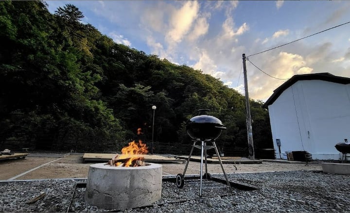 — კემპინგის გრილი (20 000 KRW): სანთურა, კემპინგის გრილი, მაკრატელი, მაშები