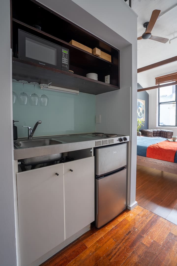 Სამზარეულოში არის ქურა, მიკროტალღური ღუმელი და მაცივარი, რომელიც გთავაზობთ ყველაფერს, რაც გჭირდებათ სახლში მომზადებული კერძებისთვის. Მნიშვნელობა არ აქვს, მზა საუზმეს ამზადებთ თუ მყუდრო ვახშამს, პირველადი საჭიროების ნივთები თქვენს ხელთაა.