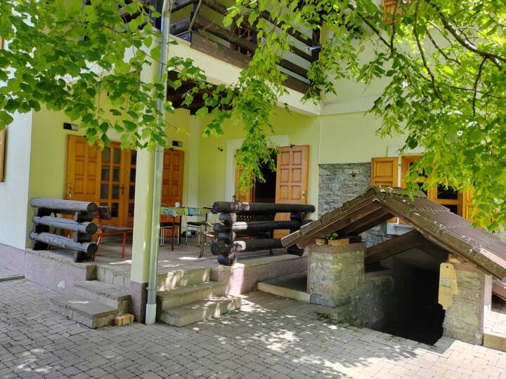 Განმარტოებული სახლი. ორი მისაღები ოთახი, საძინებელი ორადგილიანი საწოლით, ორი საძინებელი ორი საწოლით. Მისაღებ ოთახში, კუთხის გასაშლელი დივანი. Სასადილო ოთახი დაახლოებით თხუთმეტი ადამიანისთვის. Სამი სველი წერტილი. სრულად აღჭურვილი სამზარეულო. Შიდა სიგნალიზაციის სისტემა, გარე ვიდეომეთვალყურეობა. Ორი სმარტ-ტელევიზორი , Wi ‑ Fi, PS4, ფოსბოლი, დარტსი, პინგ ‑ პონგი, Netflix, კონდიციონერი. Საცხოვრებელი ბარბექიუთი და შამფურით. 20 000 მ2 შიდა ეზო.