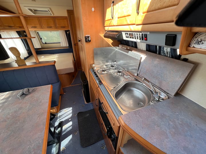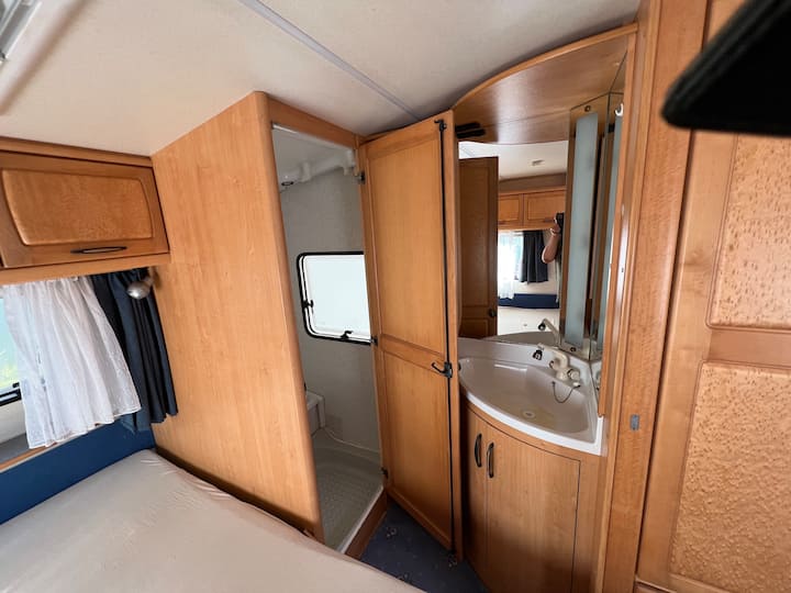 Მყუდრო ავტოფურგონი სამზარეულოთი, პატარა საშხაპითა და უნიტაზით.