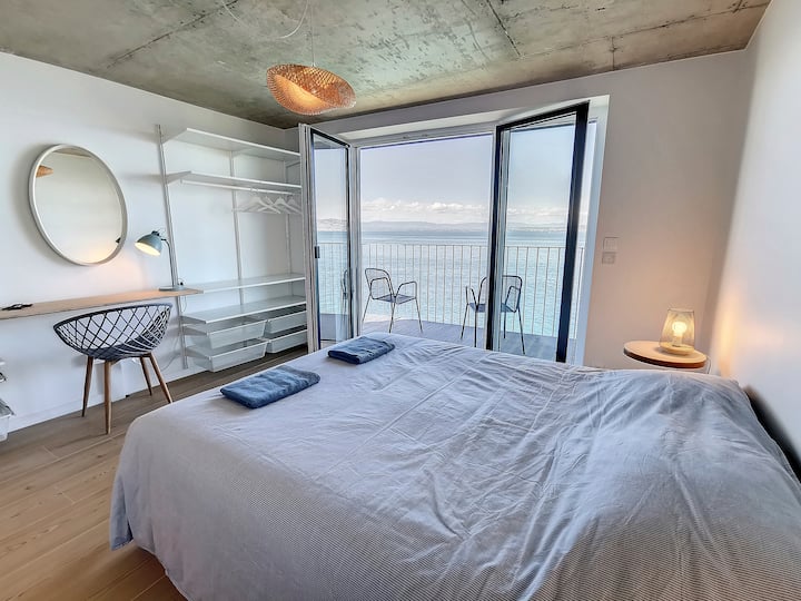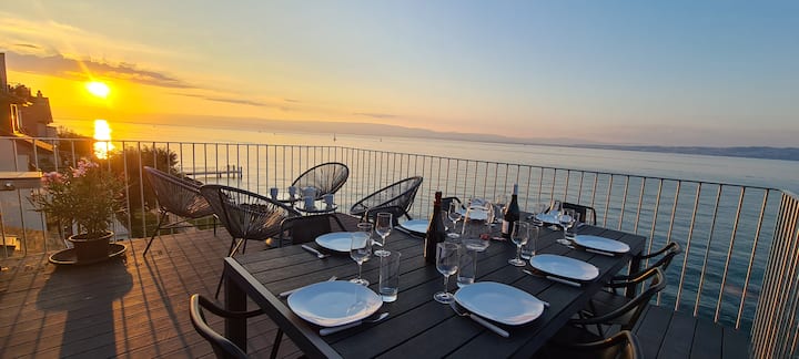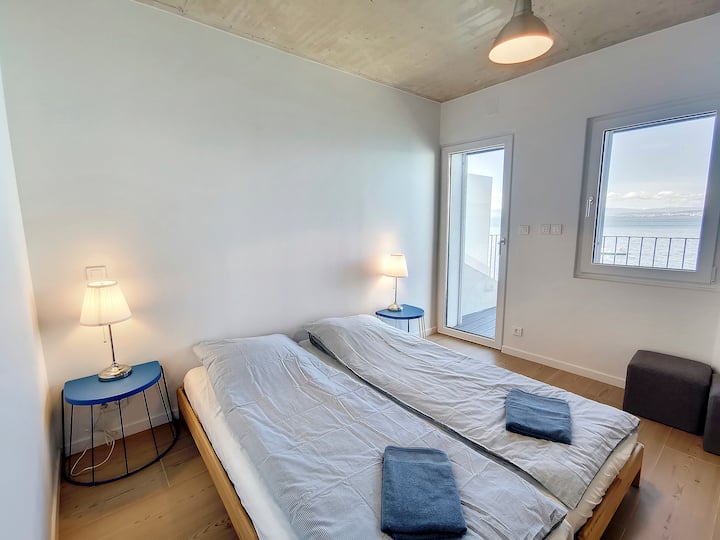 Les Terrasses du Léman, ფართო ბინა ჟენევის ტბის თვალწარმტაცი ხედებით. Იდეალურია ოჯახებისთვის, იტევს 8 ადამიანს. Საბავშვო საძინებელი ანტრესოლით, მთავარი საძინებელი აივნით, მთავარი ფლიგელი ცალკე სააბაზანოთი. Მისაღები ოთახი ღიაა ტელევიზორის კუთხის მქონე სამზარეულოსთვის. Დიდი ტერასა ბარბექიუთი და ბაღის ავეჯით. Ტბაზე ცალკე გასასვლელი საცურაო და საწყლოსნო სპორტისთვის განკუთვნილი პონტონით. Ოჯახური დასასვენებელი გარემო, ღია ცის ქვეშ ვახშამი და მზის ჩასვლა ტბაზე !
