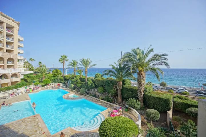2-ოთახიანი ბინა მე-6 სართულზე ზღვის ულამაზესი ხედით ტერასითა და აუზით, 35 მ2 მდებარეობს დაცულ საცხოვრებელში, ქვიშიანი პლაჟებიდან 100 მეტრში.