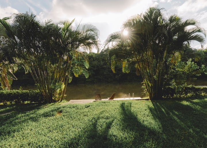 Კომფორტული სახლი მდინარის ოქროსფერ პირში აუზით