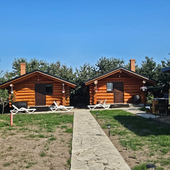 ხის სახლი ღია ცის ქვეშ ტყისა და მთის მდინარით