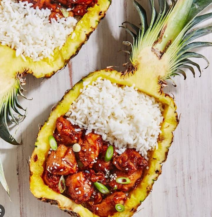 Ანანასი და სპამი შემწვარი ბრინჯი, ნივრის კრევეტები შამფურზე, ჰავაური სიმინდი კობრზე, ჰავაური ტკბილი რულეტები