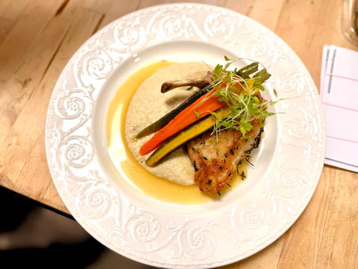 Ფრანგული ელეგანტურობა: ჭარხლისა და თხის ყველის ტარტარე, ხახვის velouté Gruyère-ს ხრაშუნა, კამის-ნარინჯისფერი სალათი, შემწვარი ქათამი ცელერიკით ან პროვანსული კოდი და ნუშის ფინანსისტი ახალი კენკრით. Ტეროირზე ორიენტირებული, დახვეწილი და დახვეწილი.