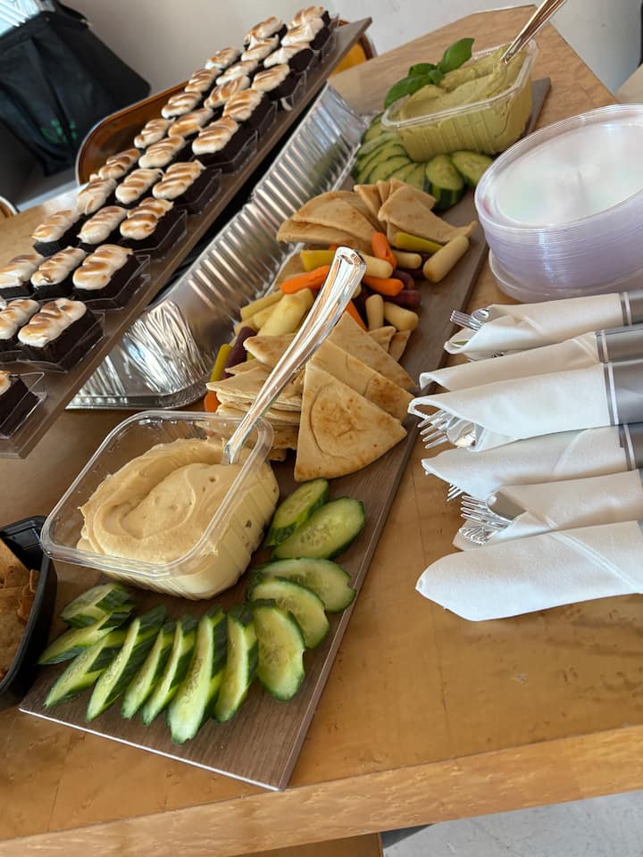 Ჭიქების (მინი ჩარკუტერი) ჭიქები, ჰუმუსის დუეტის დაფა და ტკბილეული