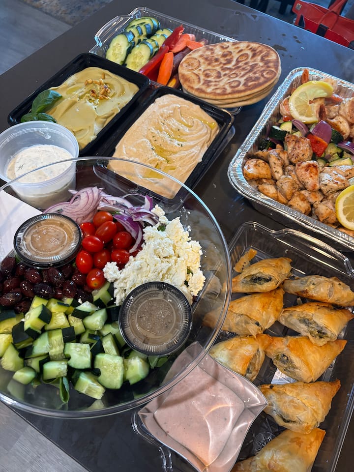 Სპანიკოპიტა, ჰუმუსი და პიტა, ბერძნული სალათი შემწვარი ქათმის ბოსტნეული და ბრინჯი და ტკბილეული. Იდეალურია მეგობრებთან ერთად ლანჩისთვის air bnb ‑ ში
