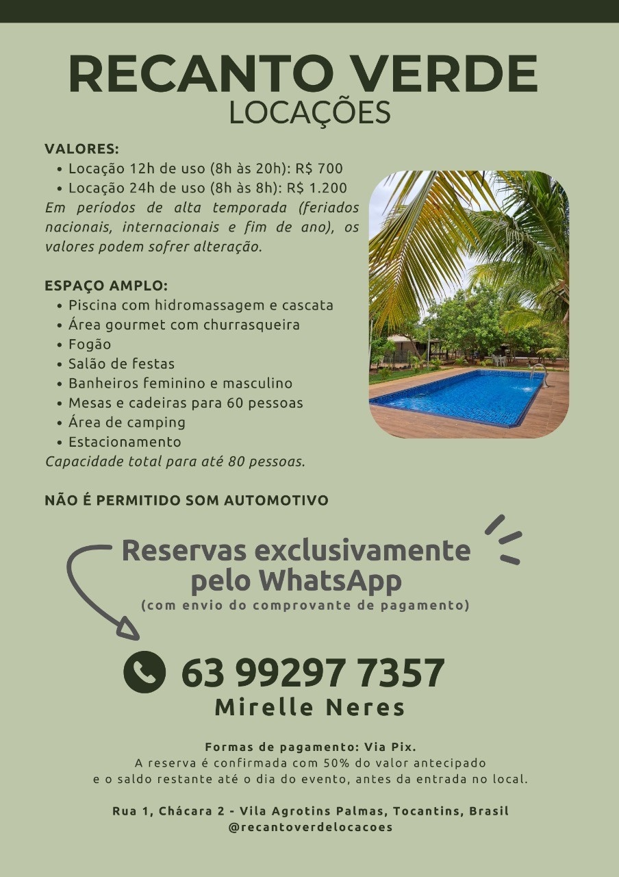 Მშვიდი ადგილი ოჯახთან ერთად დასვენებისთვის, გარემო ლამაზი ბუნებით და თვალწარმტაცი პეიზაჟით, მდინარე ტოკანტინსის ულამაზესი ტბა, ერთი მყუდრო ოჯახი, ორი საძინებელი ორადგილიანი საწოლით, ლამაზი კარგად განლაგებული სამზარეულო დანა-ჩანგლის ჭურჭლით და სხვებისთვის, რომ ლამაზი კერძები მოამზადოთ და დატკბეთ ბუნებით ოჯახთან ერთად. Ყველა დაგებული გზა, კემპინგის ადგილი. Თქვენი თარიღის გაცნობა და დაჯავშნა ნამდვილად ღირს.